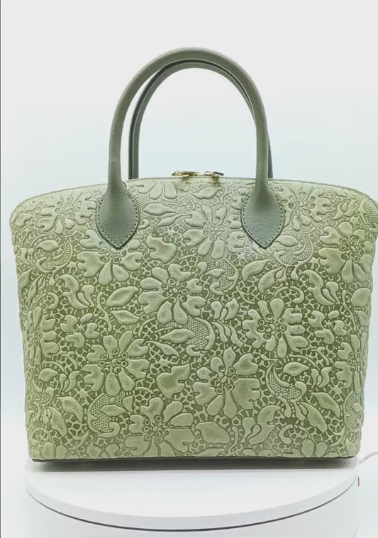 Army Green Genuine Leather Floral Embossed Handbag Satchel – Made In Italy