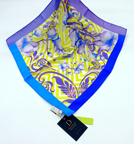 Italian Silk Handkerchief/Neckerchief Floral Square Scarf 17x17 – Made In Italy - Yellow, Blue, Purple