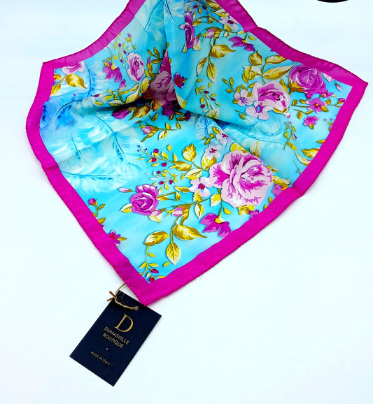 Silk Pink Sky Blue Handkerchief/Neckerchief Floral Square Scarf 17x17 – Made In Italy