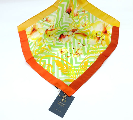 Italian Silk Handkerchief/Neckerchief Floral Square Scarf 17x17 – Made In Italy - Green, Yellow, Orange