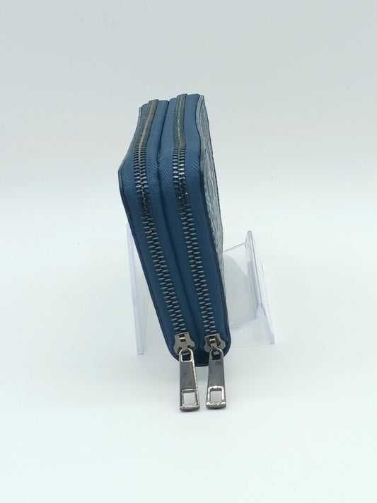 Genuine Croc Embossed Leather Double Zip Wallet – Made In Italy - Blue