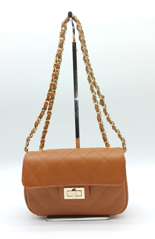 Genuine Leather Quilted Handbag (Small) – Made In Italy - Cognac Brown