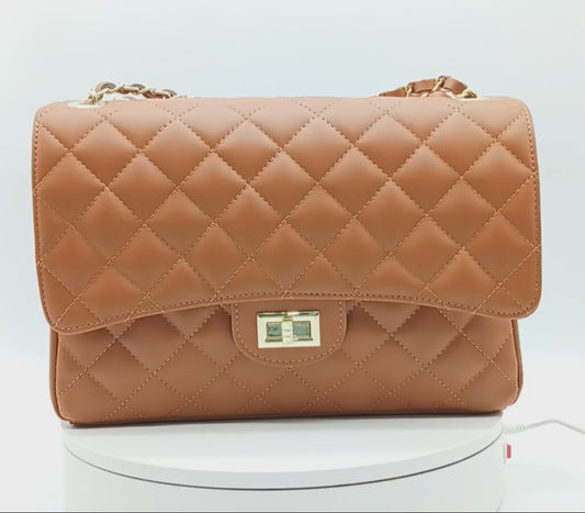 Genuine Leather Quilted Handbag (Medium) – Made In Italy - Cognac Brown