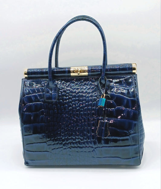 Lock & Key Shiny Croc Embossed Genuine Leather Handbag Satchel – Made In Italy - Dark Blue