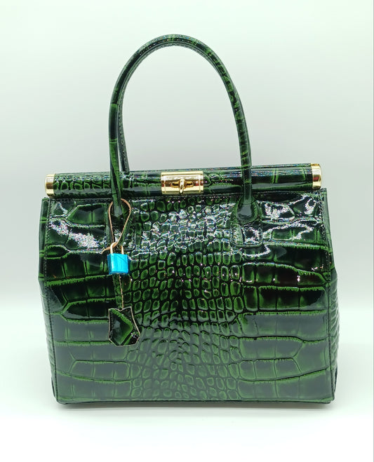 Lock & Key Shiny Croc Embossed Genuine Leather Handbag Satchel – Made In Italy - Green