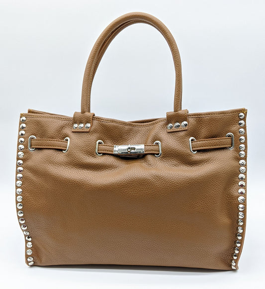Genuine Pebble Leather Studded Satchel - Brown – Made In Italy