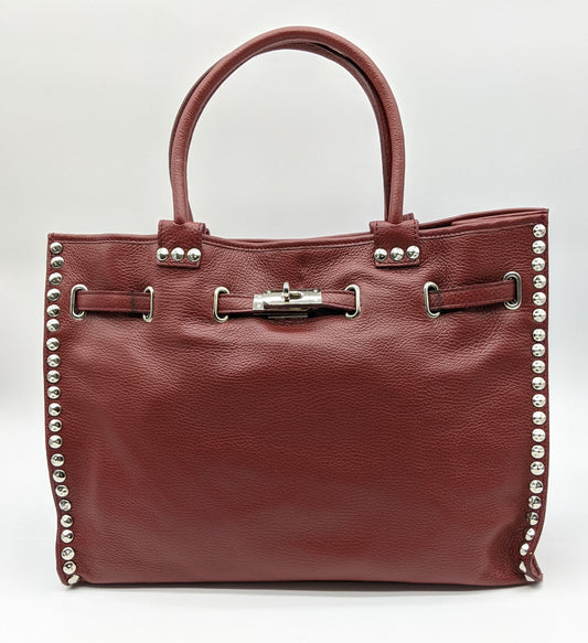 Genuine Pebble Leather Studded Satchel - Burgundy – Made In Italy