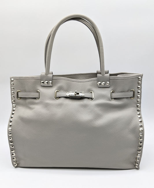 Genuine Pebble Leather Studded Satchel - Gray – Made In Italy