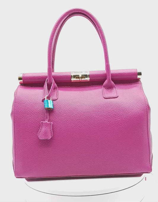Lock & Key Genuine Pebble Leather Handbag Satchel - Fuchsia – Made In Italy