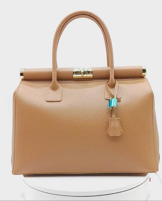 Lock & Key Genuine Pebble Leather Handbag Satchel – Made In Italy - Taupe