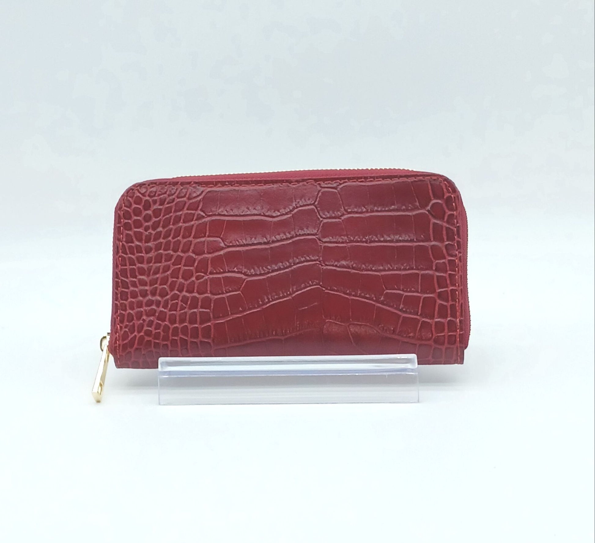 Genuine Croc Embossed Leather Zip Wallet – Made In Italy - Dark Red