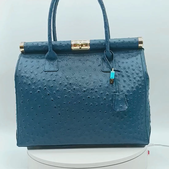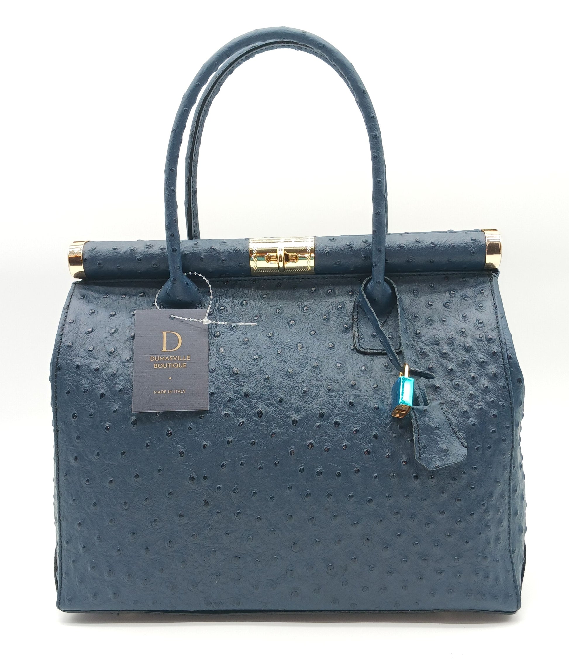 Lock & Key Genuine Ostrich Embossed Leather Handbag Satchel - Blue – Made In Italy