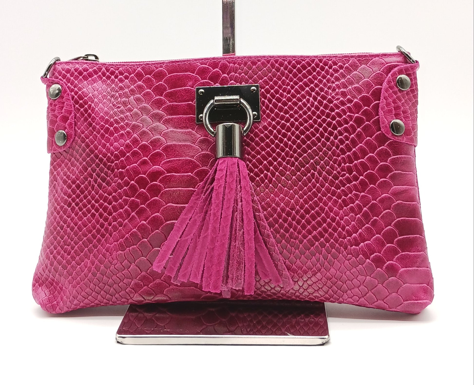 Snake Embossed Genuine Leather Crossbody Handbag - Fuchsia – Made In Italy