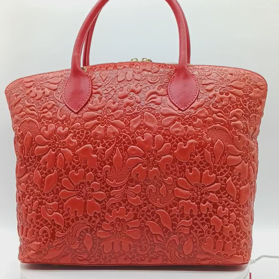 Red Genuine Leather Floral Embossed Handbag Satchel – Made In Italy